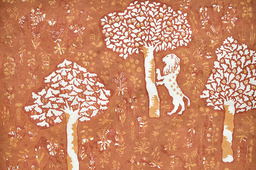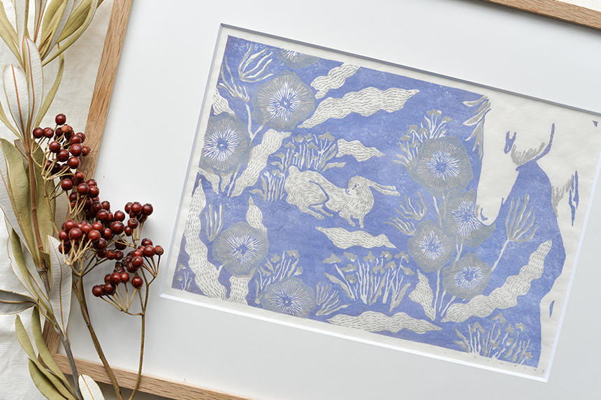 彫った部分は空白になり、残った部分に色がつくので、制作中は影をひと彫りひと彫りすくい取っているような感覚になるそうです。そんなことから「木版画=影をすくいとるような手仕事」だと感じており、このタイトルが頭に浮かんだのだそうです。