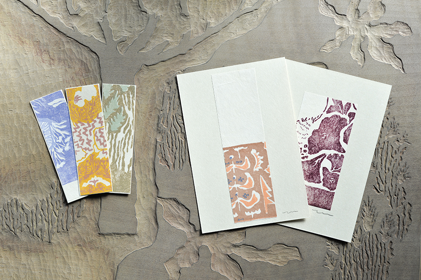 版画で作ったしおりやはがきなどもご用意しています。いずれも500円(税込)