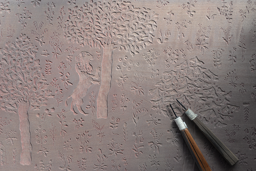 メインビジュアルの木版画作品「嗅覚」の制作途中の様子。写し取られたあとの”影”を想像しながら彫られていくのでしょう。