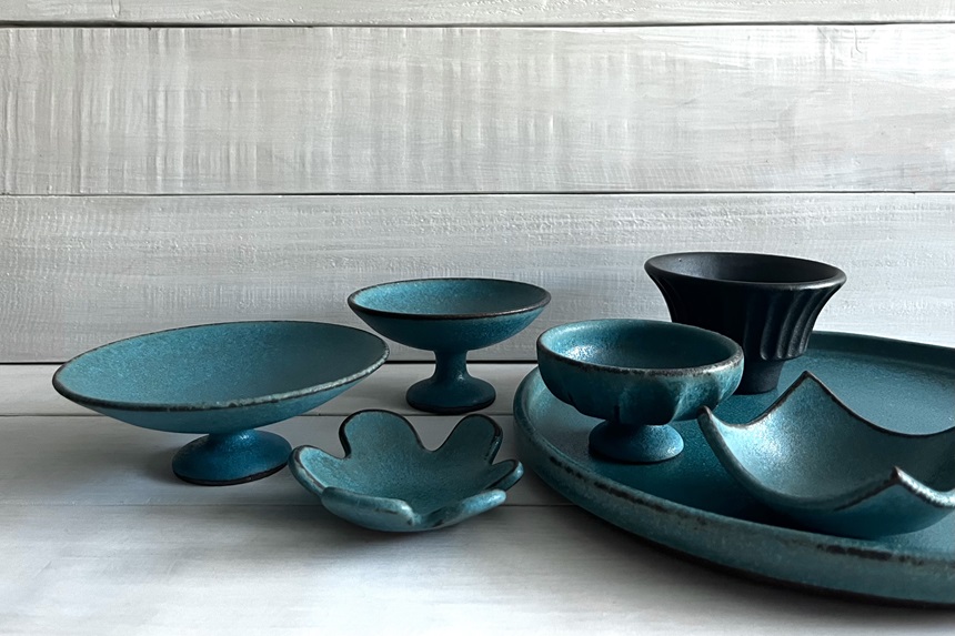 日本橋店のギャラリーが、この秋、「Pottery studio Boo」の陶器で美しく染められます。古の青銅器を思わせる深く静かなブルーは、どこか神秘的で、時を超えて私たちを魅了してくれそうです。こういう器との出会いは、きっと暮らしに強い変化をもたらしてくれるはず。そんな強い存在感に惹きつけられて、主宰の里見さんにお願いしていた個展がとうとう実現しました。