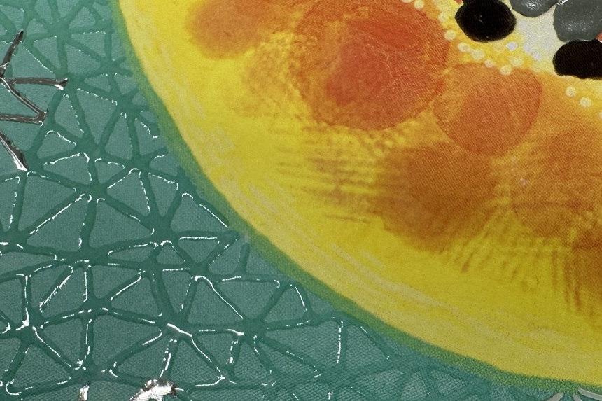 さらに、栗原氏が愛する果物や生物の溢れる瑞々しさを、箔や透明樹脂による盛り上げ加飾で表現し、原画とは異なる新たな魅力を創造しています。この一連の製法を、わたしたちは「Creative Works Print(クリエイティブワークスプリント)」と名付けました。