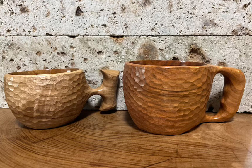 孝之さんの代表作でもある丸太から削り出された木製のマグカップは、薪ストーブ用に集めていた丸太を見て「燃やすだけではもったいない」と感じたことが制作のきっかけでした。生木を削り、ゆっくり自然乾燥させることで、木がもつ豊かな表情を生かした一点ものに仕上げています。